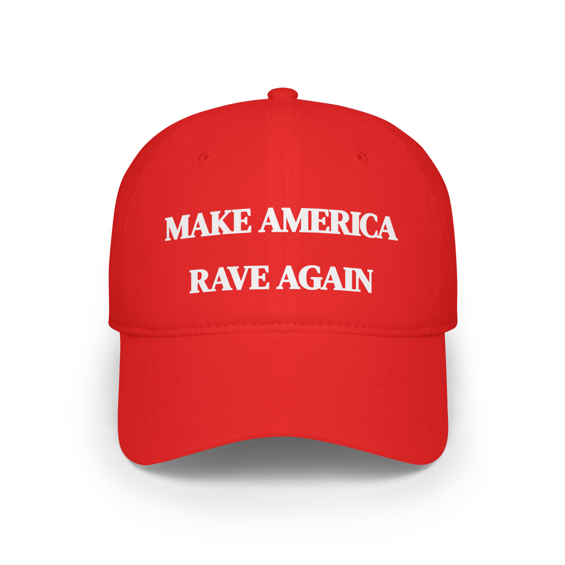 MAKE AMERICA RAVE AGAIN. What? No one owns red hats with white letters.